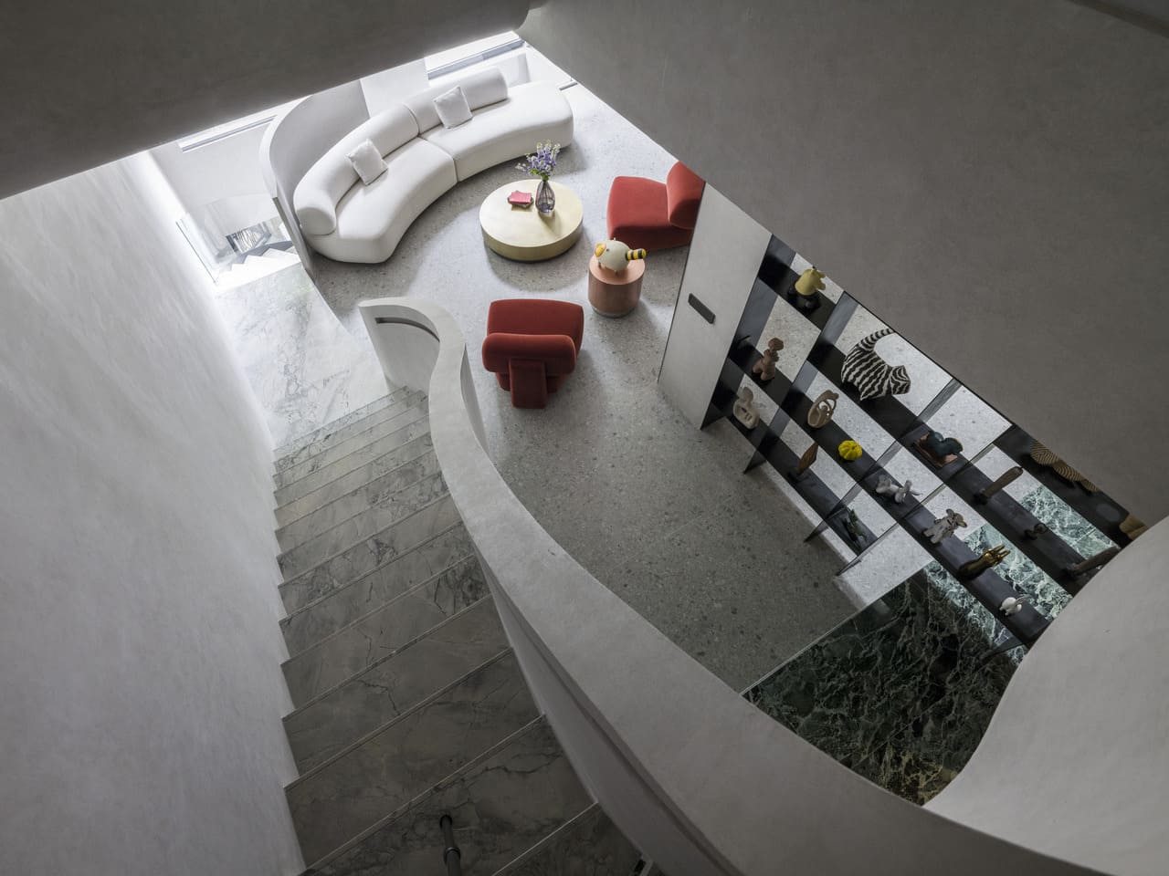 《聚場》是一處以垂直院落概念構築的三代共居宅邸,弧形階梯與書牆天井串起公共與私密場域,在多層結構中營造聚合與轉場。