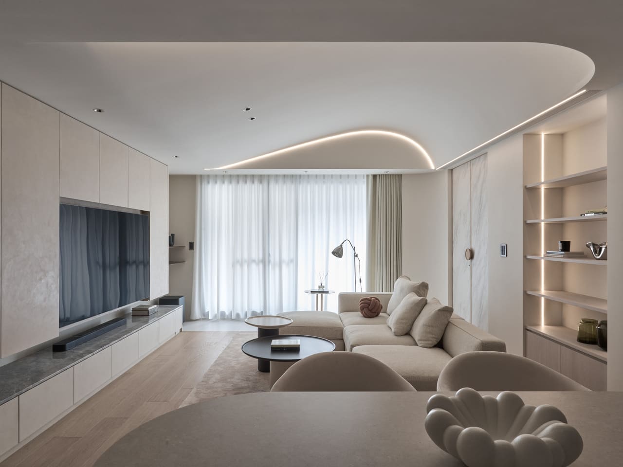 全案以弧形為筆、光影為墨,在低矮結構與複雜樑柱間重塑空間秩序,讓曲線與光線共構靜謐典雅的居所風景。