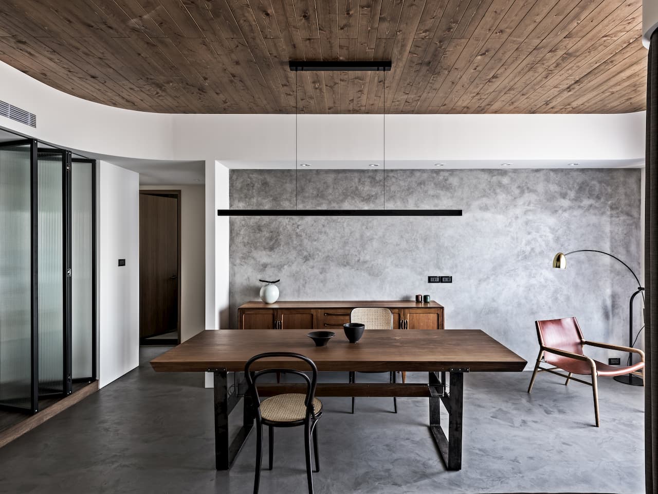 此案運用許多圓弧曲線手法,從玄關的玻璃隔柵、客廳天花板、端景牆面至餐廳收納櫃等,呼應建築外觀的流線形體,並以優雅的曲線點出東方的雅緻氛圍。透過濃厚的京都紅置入東方色彩,再以金銅收邊點綴,內斂的奢華風格突顯屋主的低調性格,讓設計不只是浮光掠影,而是在靜謐的生活中不時激起的陣陣漣漪。