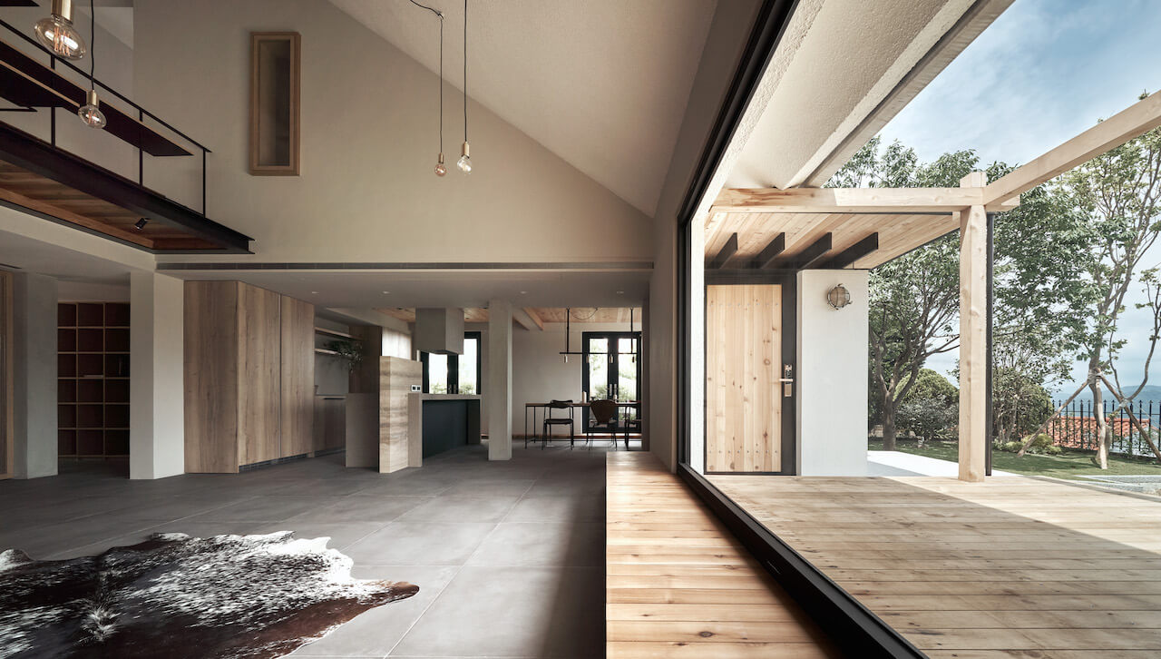 在平面佈局上,將1樓整塑為層次豐富的公共空間,藉由場域之間的中介地帶,為屬域關係建構舒鬆亦緊密的曖昧感受,既保有個人舒適的活動領域,視線上又能時時關照家人動態。對外,打開四面立牆,將環境山景納入室內,使家居生活面朝山谷景致,居室感受不再封閉。外部再設立平台圍繞建築量體,創造室內、外的中介空間,將居室體感延伸至戶外,淡化內、外分界,將生活浸入自然懷抱裡。