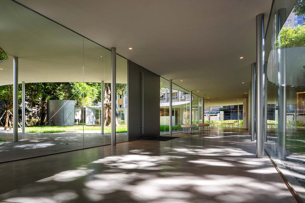在空間佈局上,配有模型區、洽談區,以及服務機能如洗手間、茶水室等,設計師企圖將接待中心營造出「藝廊」的高質感參觀體驗,流暢動線配上大面玻璃窗所框出的濃蔭森然,耳邊傳來陣陣清脆鳥鳴配樂,強化自然氛圍,並予人輕鬆愜意的感受。設計師認為,半戶外的廊道是這個案子裡最重要的一個環節,不僅串接了室內外空間,亦提升整體的視覺層次和律動變化。