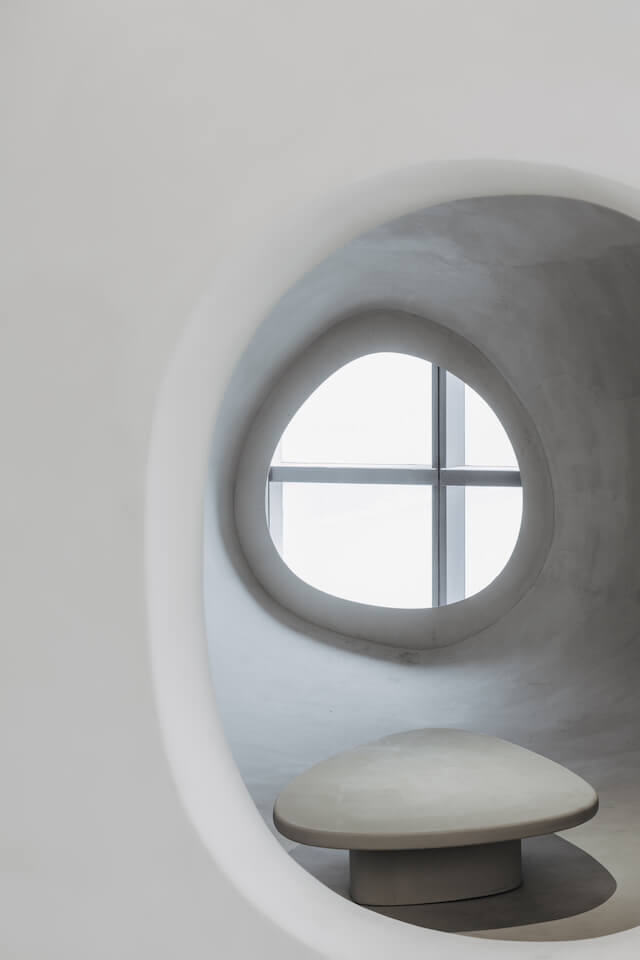 渾然一體的書洞空間,溫柔的光渲染讓空間失去了指向性,在隱密的環境裡,只能透過洞口窺探環境。