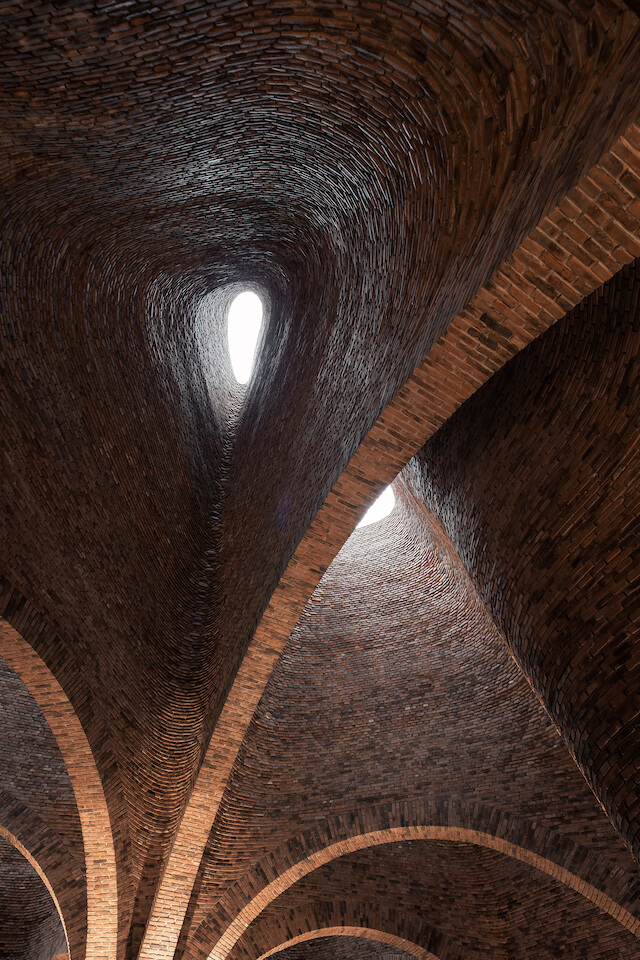 順著建築結構,紅磚向上收攏,圈出一個個採光窗。