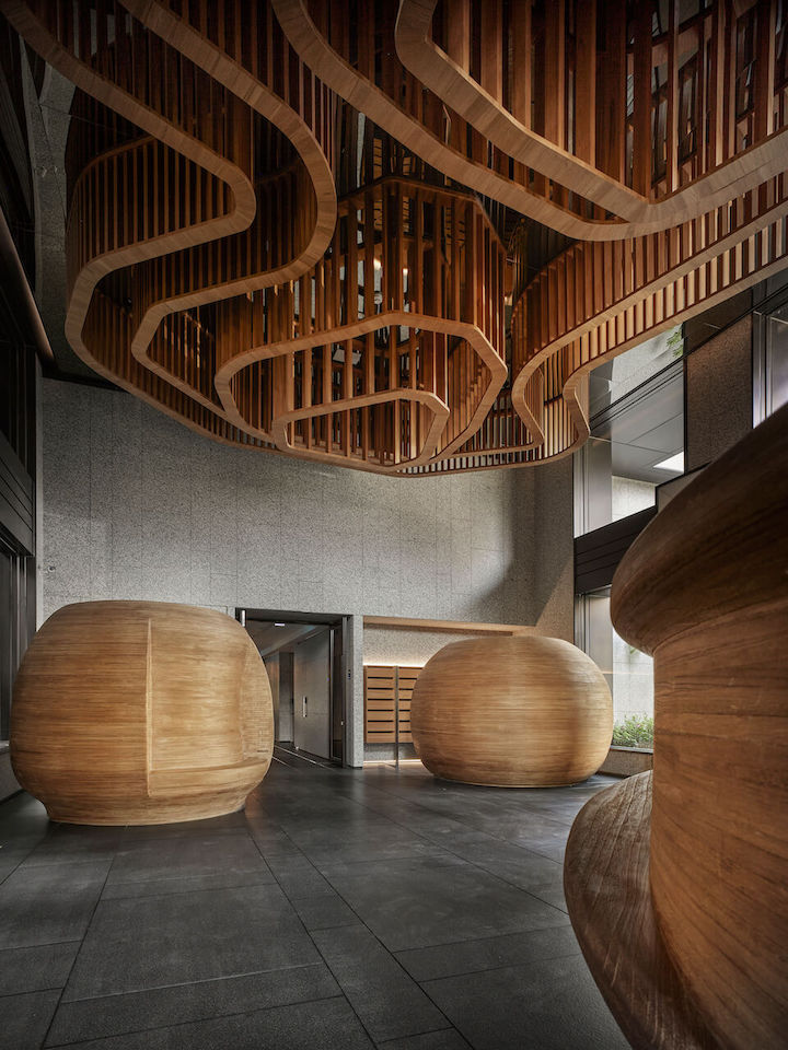不同於一般公設的富麗堂皇,夏利設計重新拾起傳統工藝,以雲、石、木三個元素作為空間主軸。以「石」為立基,轉化石頭形體為空間機能,而「雲」的概念則被轉化為建築結構,最後則透過「木」為材料詮釋。大廳三顆以實木工藝鑲嵌的木造石頭,分別圍塑出接待櫃檯、信箱櫃以及宅配收納區,手工打磨而成的木石,材料、顏色、形體上都不盡相同,自由奔放的曲線柔化方正空間予人嚴肅感,而金屬鏡面天花板,能透過映射放大形體,創造出天空的無邊無際,搭配線型木格柵呈現行雲流水般的雲層,場域透過最簡單的材料,將自然無聲無息的帶入。