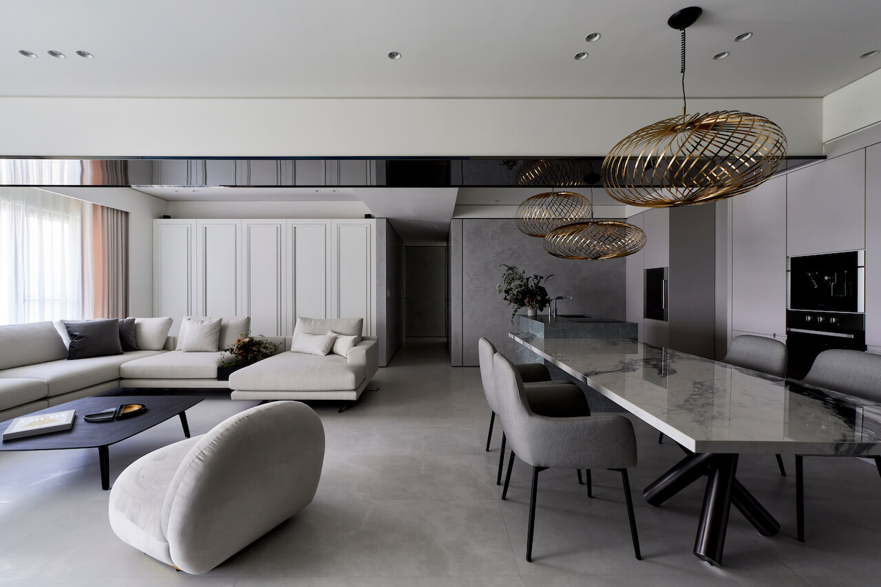 全案在簡約的風格中,添加些許的奢華質感。福璽設計以「月球」的概念延伸設計,捨棄極簡風格中常見的白色,改以不同明亮、深淺的灰色做層次堆疊,好似月球的凹凸表面因光線反射而呈現的色澤變化般;仔細端倪會發現,這些灰有的平滑亮麗,有的帶有絲絲紋理,藉由材質的紋路為視覺增添活潑氛圍。