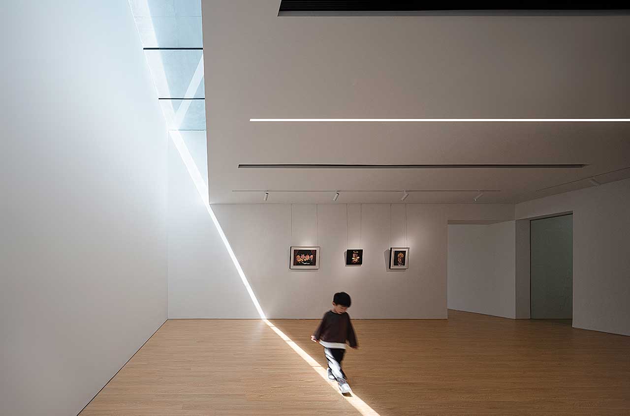 畫廊內,由原有建築井字梁形成了強烈的秩序感,在燈光烘托下形成舒適的光環境。