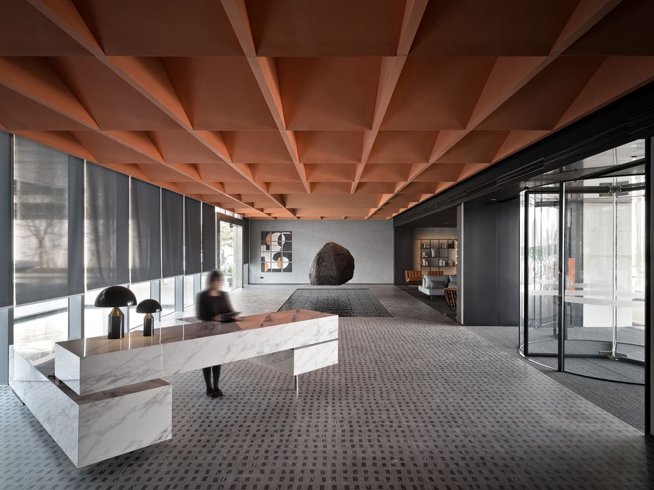入口酒店式大廳,櫃台呈現量體轉折及輕盈感。