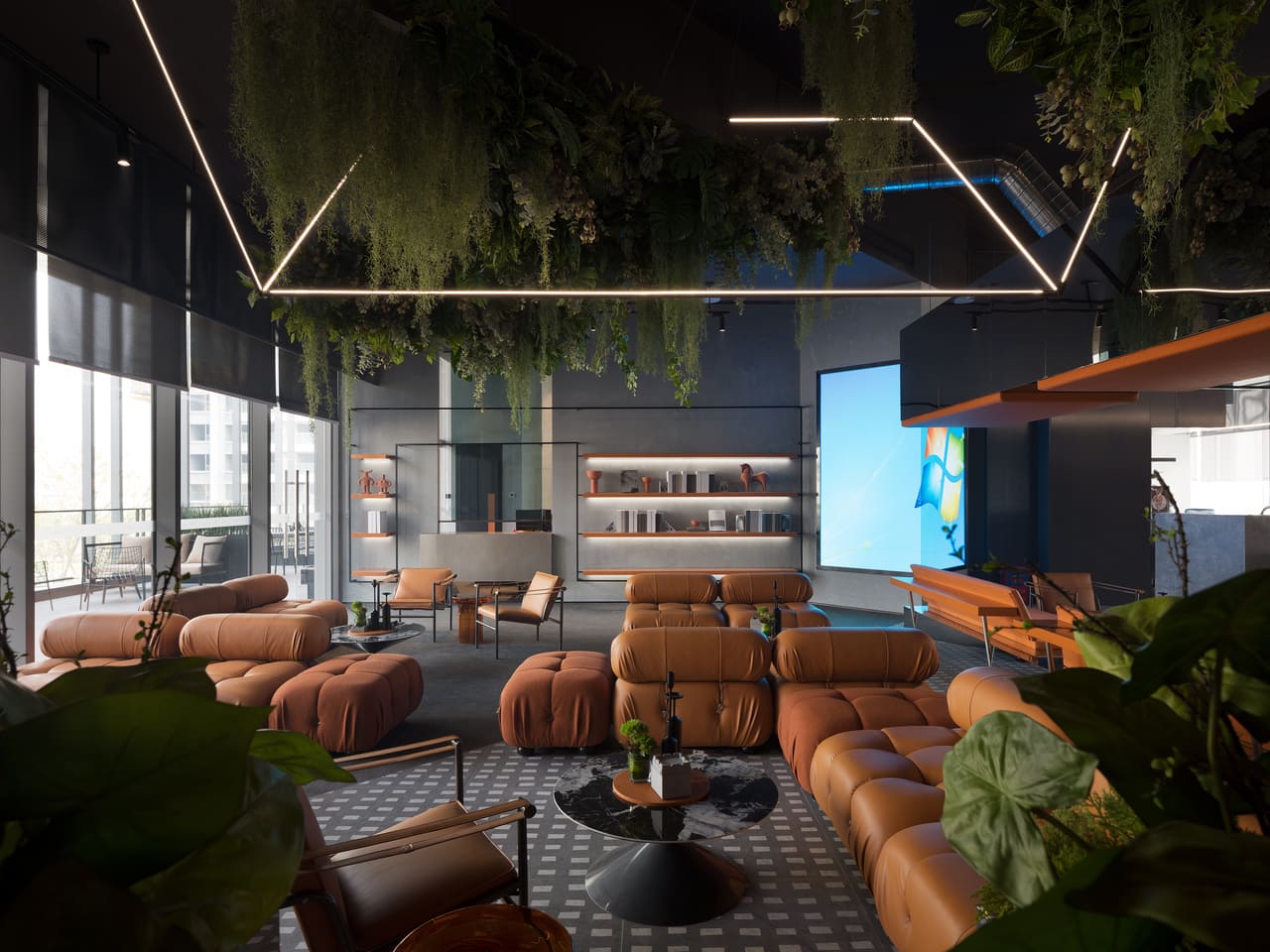 此外,另項設計重點即為多變的天花板及燈具造型,同樣透過,2 樓銷售中心由於為臨時空間,考量材質永續性,使用燈條形塑方形轉折量體;1 樓透過格狀天花仿擬魔術方塊的視覺效果,B1 天花則自格狀天花拆解、重組,宴會廳透過中空手法輕盈化量體感,除了方塊各自獨立的轉折外,整體天花板又形成第二項度的轉折,突顯空間立體性並修飾管線與樑柱存在,網咖區部分鋪設燈膜滿足均勻照明需求,健身房使用片狀燈板造型強調動態感,更與地毯格狀圖樣呼應,形塑盒狀空間感,且與空間走向再次形成轉折。設計師說明,此作照明設計十分重要,一般常用的暖光反而會受橘色的格狀天花暈染,導致過於昏黃,經過一次次的實驗後才決定以 6000K 的白光為主,並於格與格之間以 LED 細部調整,使光線不受天花顏色影響。