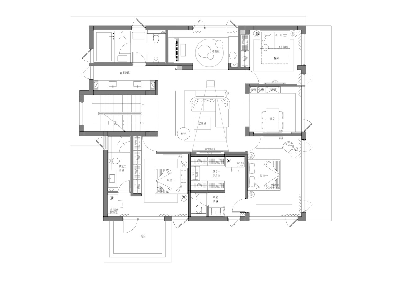 空間圍繞著中央的起居室,規劃了遊戲間、書房以及臥室。
