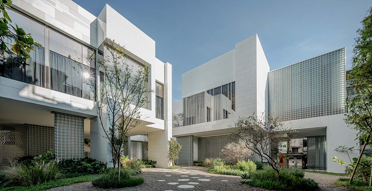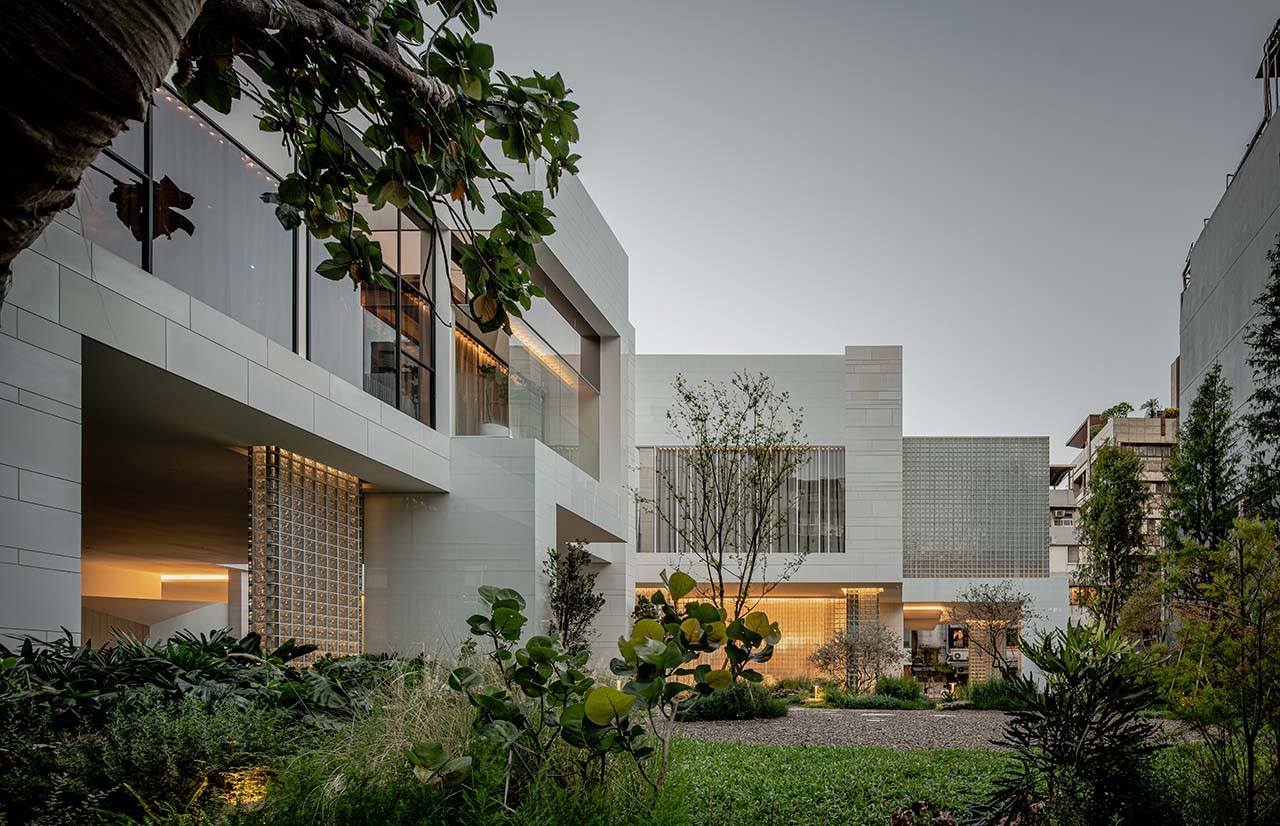 植栽部分邀請太研設計的吳書原景觀設計師共同合作,他以「小隱於野,大隱於市」的概念切入,在喧囂的城市中感受自然,植栽是烘托氣氛的重要手段,整體用一條單向的流線以及混植植栽的配置手法,以獨特方式將建築和花園串聯起來,完整了景觀序列。外觀則以業主期望的「氣勢」作為基準,擷取美術館方盒子的淨白意象,再將周圍景致抽象化,相互融合後再行解構,錯落的語彙賦予這座淨白莊園更具生命力的形體;內院則以大葉麵包果樹為主軸,藉此吸引造訪者的視線,弱化狹隘棟距所帶來的侷促感。