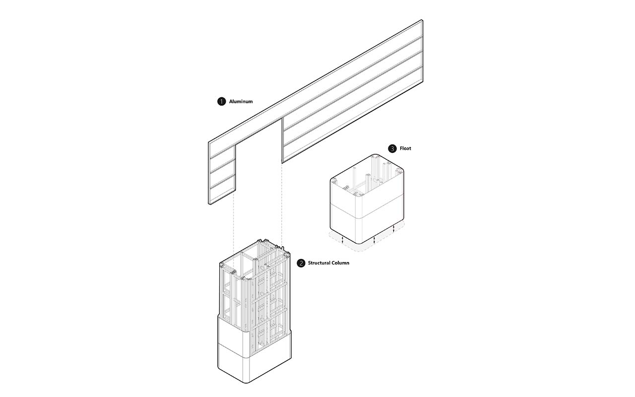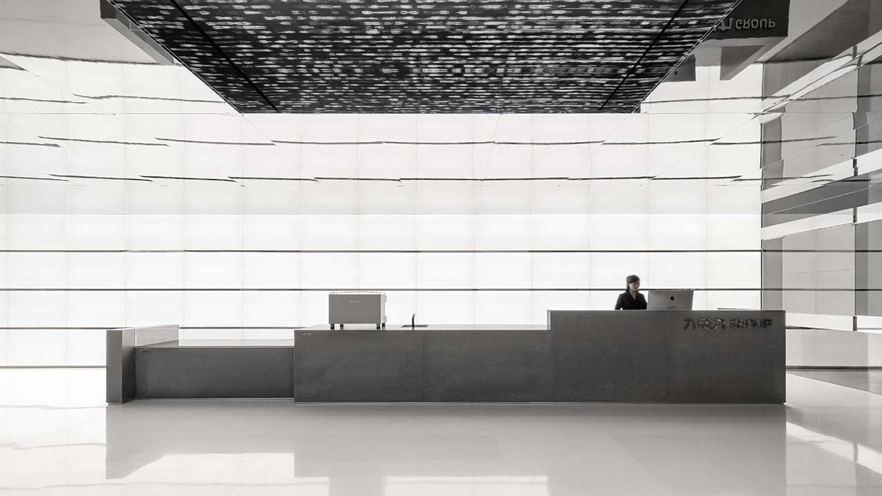 大廳置入了一個10米長的石材塊體作為接待台,而整個前台背景牆則由88塊壓克力發光模組組成,每塊皆可單獨控制明暗且拆卸維修,讓光線本身從媒介躍升成為主角;天花板的鏡面不鏽鋼結合了牆面的壓克力發光模組,強烈的延伸性打造出漫步於宇宙的情境氛圍,好似身處於無窮無盡的環境中,扭曲了參訪者的空間感知。