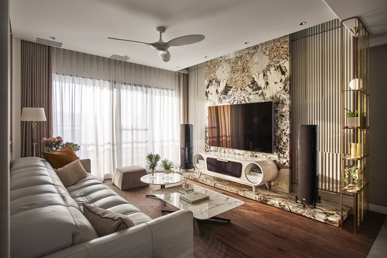 客廳使用不同尺寸的雕刻板交錯編排,而胡桃木地板則增添了公區的暖度。