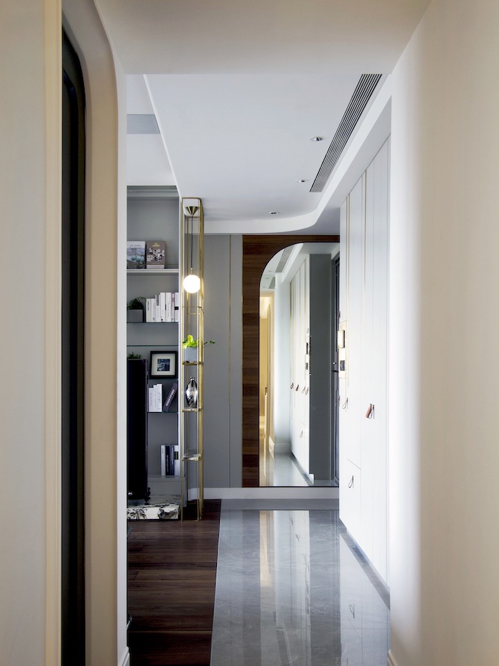 前述所提客廳跟餐廚區域配置得較為分散,設計團隊便以「地坪」作為串接區域的方式,客廳的胡桃木地板分割延伸至廊道,再透過天花板增設的鏡面反射光線,增加過道的亮度,並產生行走的引導作用,藉此將兩個半獨立公共區域做出意象的連接。