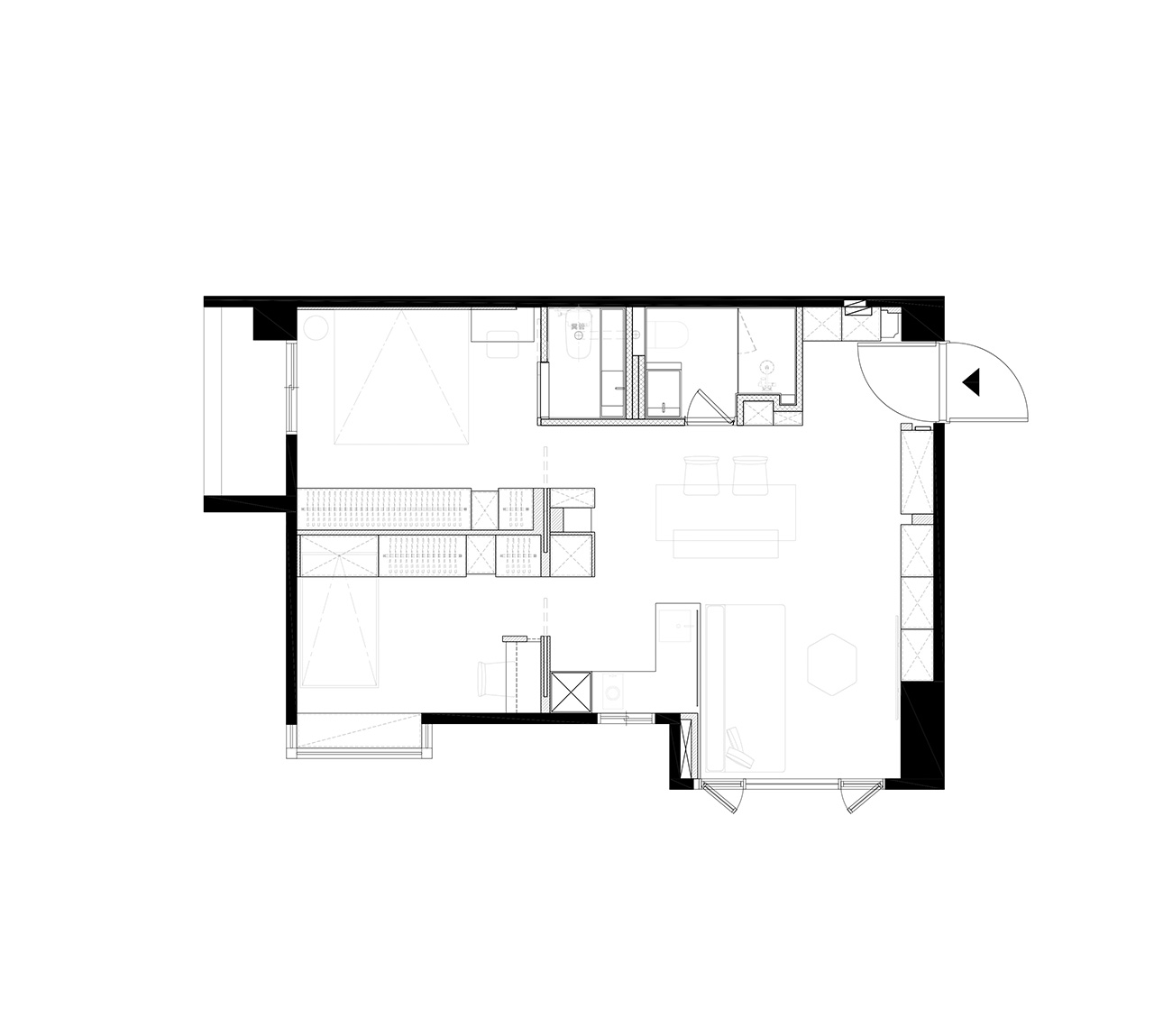 另一方面,更在平面中置入一座具分量感的量體,不僅在無形之間界定了公私領域,亦支援了三方(廚房、主臥、女兒房)的收納需求,並可將兩扇通往臥房的活動拉門隱於其中,將隱私和開放的主導權交由居住者自行掌控,保有空間最大的使用彈性。