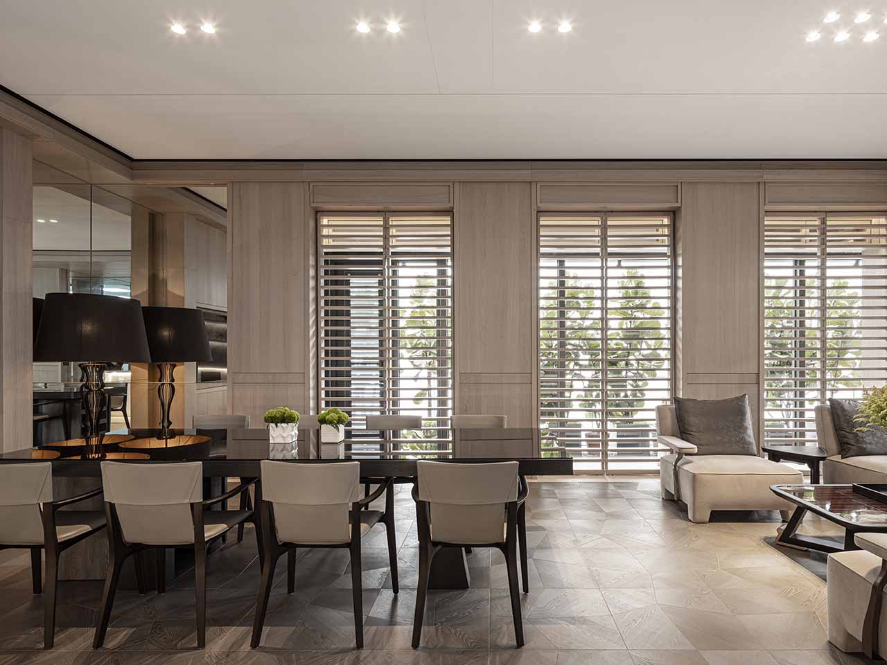 設計師期待模糊空間界線上的節點,深化「迴廊」的意象,家具軟件的選配也與居住者的日常習性息息相關,特別挑選無邊界形式的沙發,餐桌的長凳和單椅的擺放亦經過巧妙安排,讓所有的生活行為不因家具而備受限制,提供家人之間更緊密的互動可能,也帶來更具脈絡的空間層次。燈源方面則以嵌燈作為主要燈光布局,避免因吊燈影響了視線的流動性;櫃體部分增設氣氛燈,突顯業主精心收藏的公仔品項,主臥室則設置線性造型的壁燈,提升私領域質感。