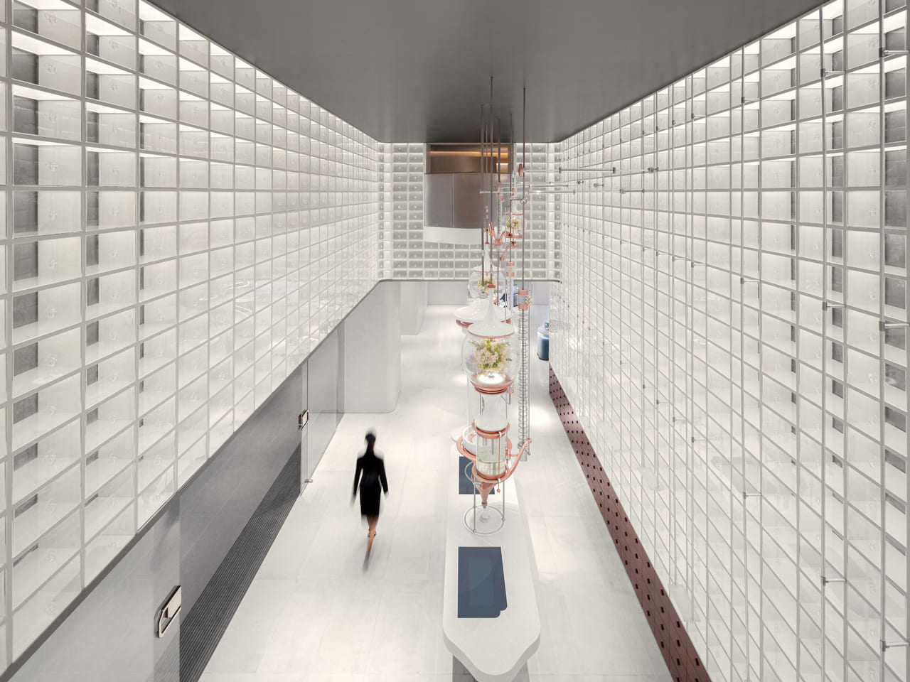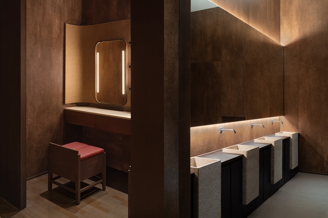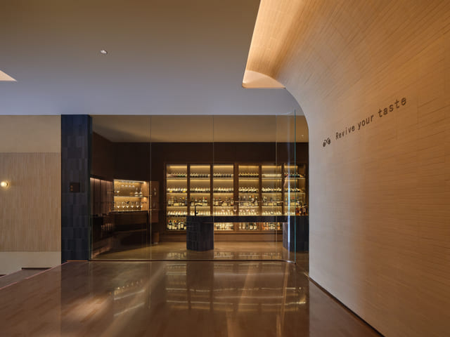 酒銀行利用大面積通透玻璃構築虛實相生的層次,暖光烘托出愜意慵懶的氣息,將天際侍酒服務優雅落地;洗手間策略性地安排多種光源,柔和細緻的光影勾勒舒緩情境,消費者可在此實際試用航旅護膚產品,將溫潤呵護的精神落實於細節處。