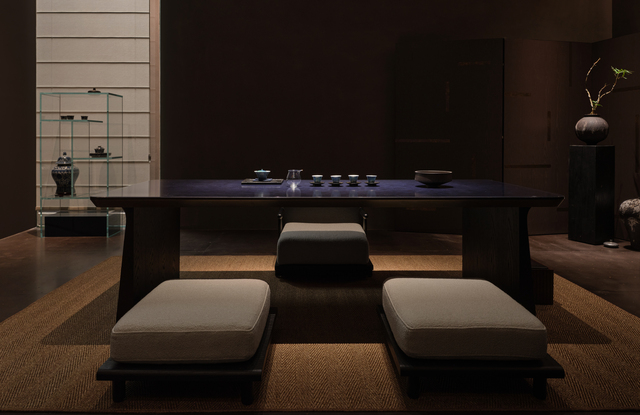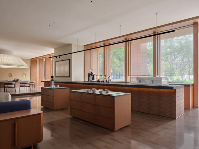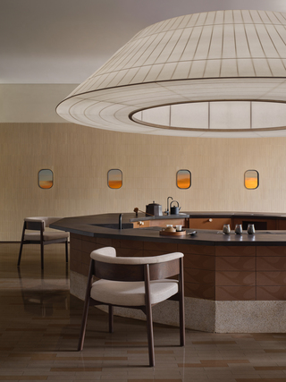 大茶室的天花板運用淺木色石磚跟金屬網編織交錯,輕盈敞亮,材質的碰撞增添對比質感,塊狀拼接的建材則以幾何韻律構築空間骨架,演繹具現代東方感的美學格調。精煉簡潔的會議廳主要用於商務接待、洽談和用餐,室內布局同樣可自由移動擺設,以高度機動性回應不同使用情境;會客廳是專區面積最大的圓桌餐廳,擷取福建土樓形象打造餐桌和吊燈,自然游移的動線更引導消費者在移步換景中加深對企業的認同和共鳴。