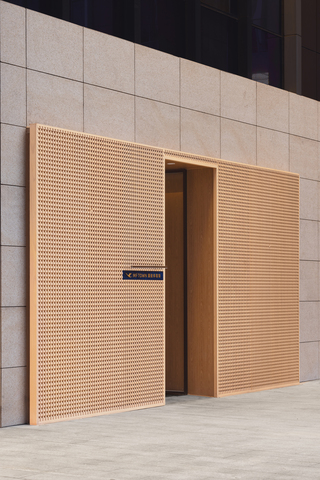 立面以黃鏽石搭建,與木紋格柵共築低調和諧的畫面。