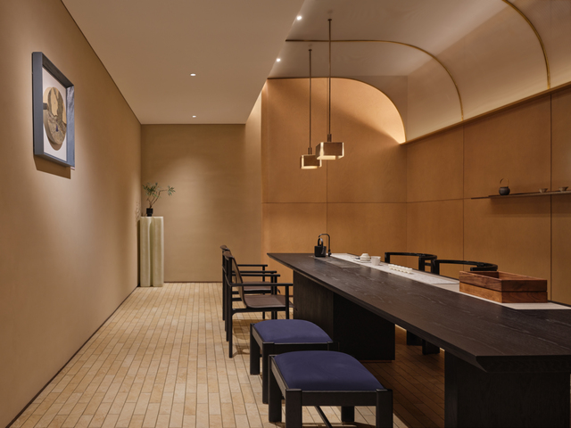專區區域則受閩南的風土人情啟發,分為海、灘、泊、溪等四個包廂,作為面向高端客群的私享會客空間,福建線雕工藝的鷺紋屏風搭配光影律動及簡練陳設,強調私密感和差異化場景。精緻的小茶室以大範圍木紋打底,並將地坪抬高,家具素雅簡約,藉此襯托出藍色大漆桌面的空靈意蘊,同時點綴花藝和古樸陶罐,讓禪意與詩意在此共生。
