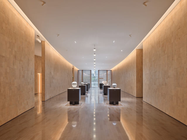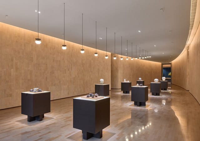 前廳作為廈航品牌美學所延伸出的策展區域,旨在打破萬里高空之上的時空限制,微弧牆面靈感源自於飛機艙體,同時引導觀眾遊走於展覽之間。移動式的拼接展示台與可調節光源滿足了靈活的策展需求,內外光影隨時間自然流轉、相融,手工感陶具在光影漫灑間更添幾分溫暖質樸;牆面皆由訂製回收軟木覆蓋,原生木紋肌理成為文化策展的背景,又巧妙劃分出流動的空間秩序。