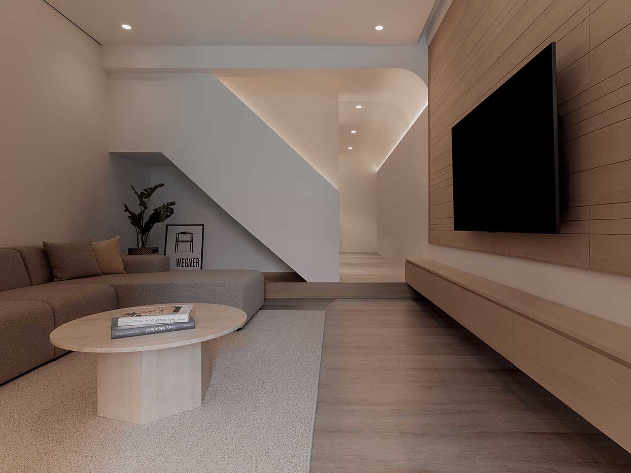 因應狹長格局,剔除所有隔牆,貫通明淨整體視野,提取重點、歸納分區,通過寬闊的走道彼此串連,使動線更加流暢。善用上下樓層區分公私場域,一樓整合會客、用餐與烹飪等等功能,採開放式設計,如建築陣列般,透過收納櫃體貼合空間結構節點,以分明卻不隔斷的手法編布客廳、餐廳和廚房的獨立性,同時維繫彼此互動;二樓則用於規劃臥室和起居相關配套機能,確保屋主的隱私和活動空間。