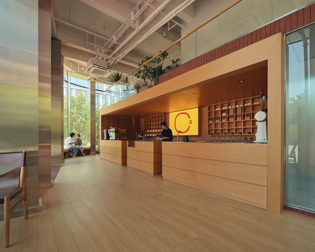 透過天花堆砌的高低差異,平衡連貫視覺與場域區劃。