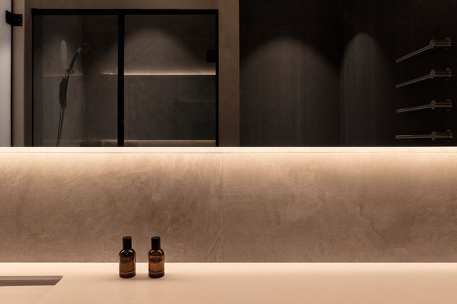 主衛浴洗手台於鏡面下方置入燈條,光源溫潤,含蓄暈染石材牆面紋理。