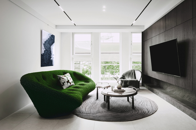 不規則的家具輪廓配合面料仿若苔癬的材質,帶來天然熔岩的聯想,配合地毯紋理和白淨底色,為客廳形塑冰島印象。