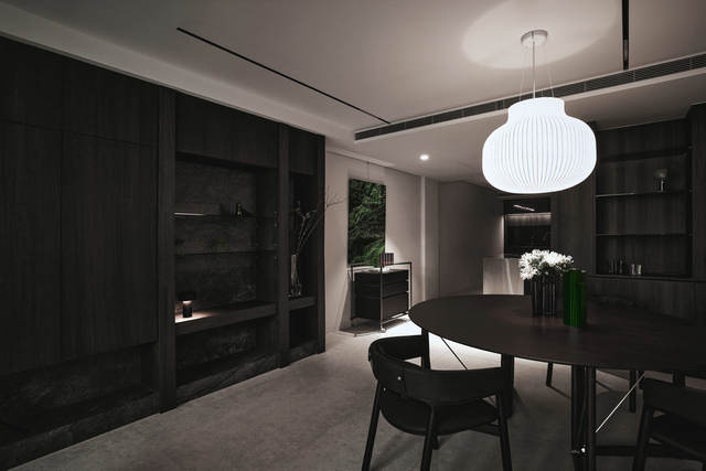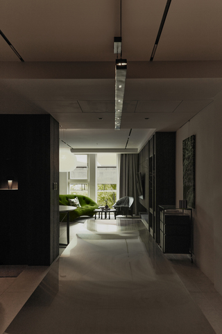 出入口自空間中段切入,通過兩個深色置物櫃包夾構成玄關,入門後可見圓潤的白色吊燈垂下、於深色襯底的背景中點亮餐桌,明確餐廳範圍;旁側的廚房置入一座狹長型的不鏽鋼中島,結合日常使用和待客機能打造洄游動線,同時透過中島指向引導目光投向對面明朗的客廳。利用建築前後並無遮蔽的優勢,設計師特意規劃三道狹長的落地窗,以光為筆,為空間描摹層次,精準預判光影效果,因應日夜變化與居者在當中的移動,勾勒整體結構深度。