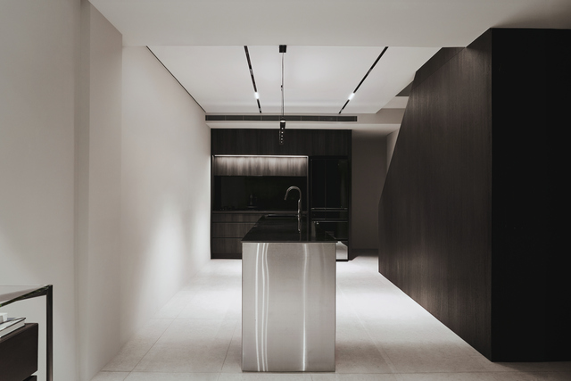 透過4米長的不鏽鋼島台定義餐廚空間的理性基調,延伸拉長整體視覺。