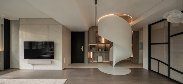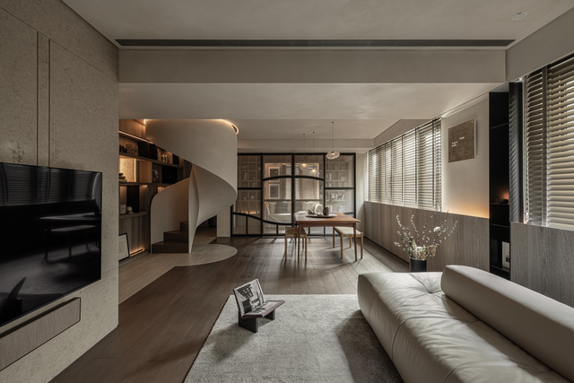 設計過程中,旋轉樓梯的施作是一大挑戰,其龐大尺度需在有限面積中精準落位,設計團隊反覆與施工團隊協調,最終讓樓梯如雕塑般成為視覺焦點。完工後,它不僅是連接樓層的動線,更象徵時間的流轉,階梯旁的黑膠唱片與書牆層架,記錄著家庭共同累積的記憶故事。