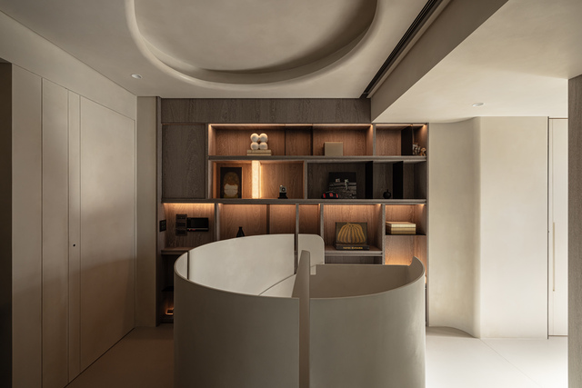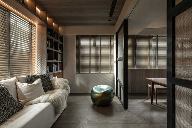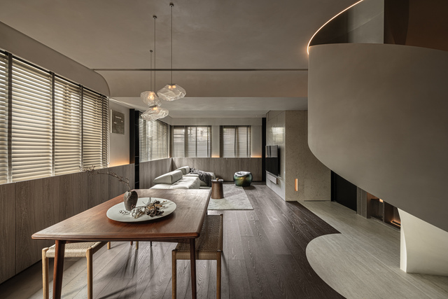 天花的弧度設計引導自然光線,透過百葉的篩落,光以柔和姿態漫射入室,塑造內斂而深邃的光影層次。家具軟裝亦呼應書香主題,餐廳吊燈如揉皺紙張懸於餐桌上方;書房沙發置於中央,營造被知識環繞的沉浸感。整體色調以淺米、煙灰與黑色木皮為主,低調中見質感,呼應屋主追求安靜、專注的生活節奏。