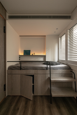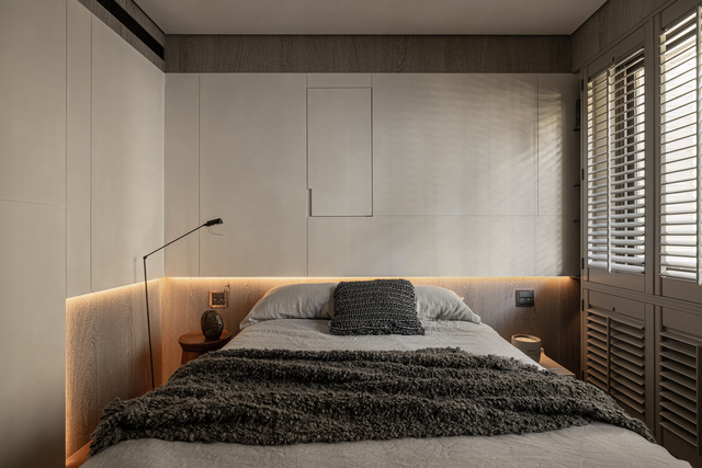 次臥運用簡約材質與間接照明,搭配百葉窗所映光影,描畫舒適又不失品味的休閒氛圍。