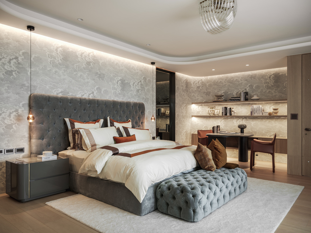 主臥獨佔L型平面的臨海側,設計團隊以「雲端度假」為概念,將就寢區、書房與休憩沙發整合為流暢的起居序列。床鋪正對落地窗居中擺設,晨起即可擁抱波光粼粼的港灣;入夜後,電動升降螢幕緩緩落下,瞬間轉換為私人影院模式。空間以藍灰色釘扣絨布床頭與雲朵壁紙鋪陳,搭配弧形書桌與渾圓沙發,營造輕盈時尚的休憩氛圍。