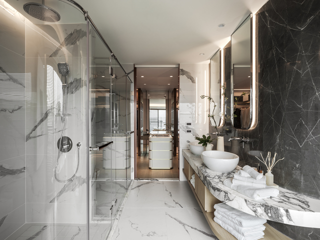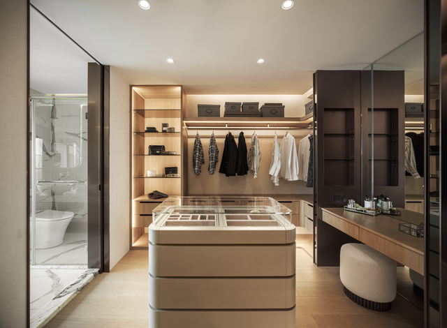 主浴將奢華感推向極致,雙動線設計串聯臥室與更衣室,獨立浴缸直面陽台海景,延伸至戶外躺椅區,重現頂級酒店的度假情境。更衣室內的中島珠寶櫃以精品陳列手法設計,在燈光的暈染下,賦予日常更衣儀式以紅毯般的尊榮感。