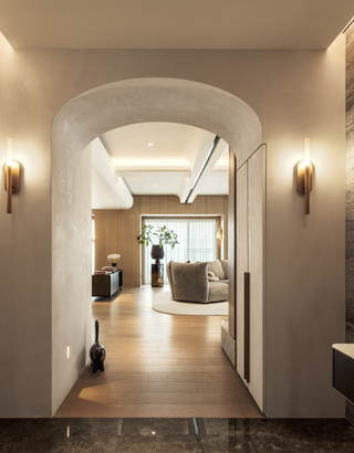 玄關壓縮空間尺度,形塑從低至高的視覺轉換,以及流暢的居家動線。