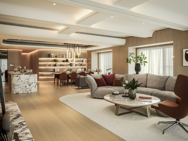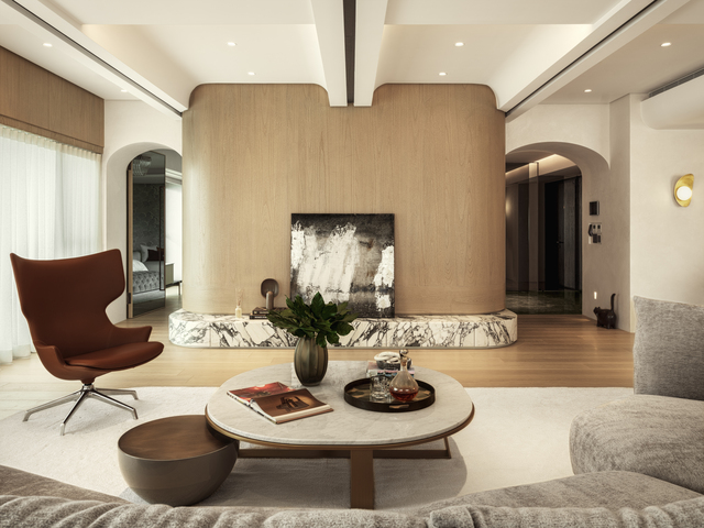 客廳作為靜謐的核心,以「風帆」為靈感的弧形天花,巧妙化解結構大樑的壓迫,流線型的白色曲面如波浪般輕盈起伏,不僅拉高視覺層次,更與窗外港灣景致相映成趣。