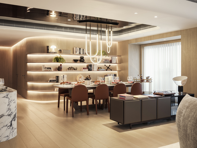 餐廳設置鏡面天花,透過反射延伸視線,佐以線條圓潤的餐椅與吊燈,勾勒出空間的流動感。