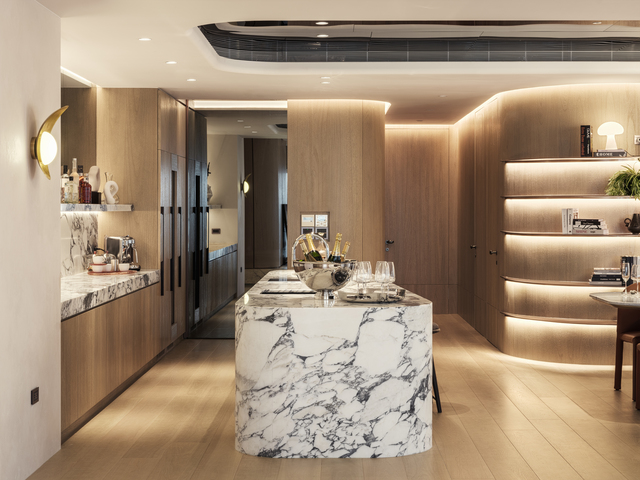 廚房規劃超長中島鋪上羅馬白石材描繪浪沫紋理,如大型藝術品般成為空間焦點,營造海景度假氛圍。