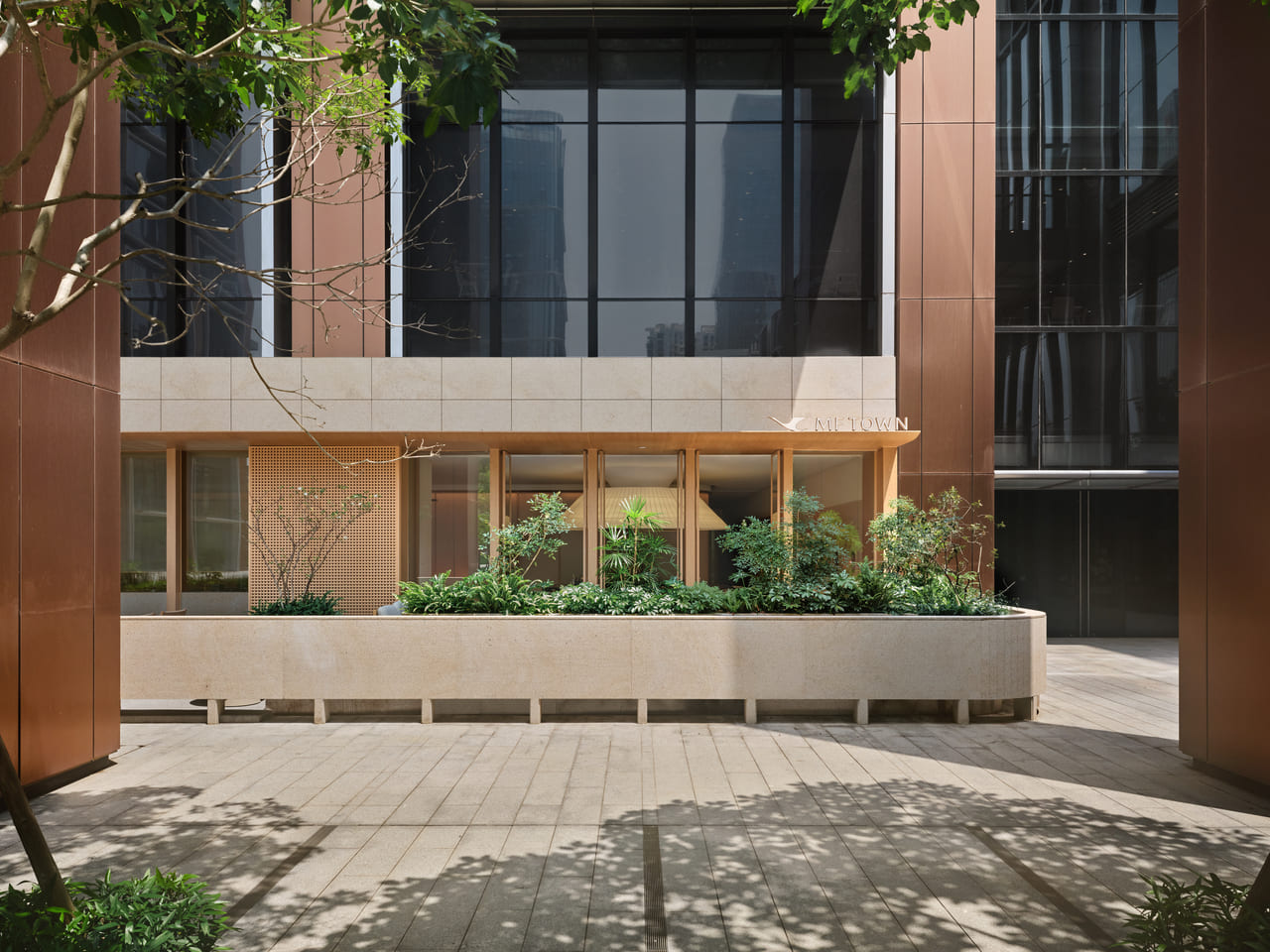露台鋪設綠調石材與植栽、室內Verde Alpi大理石相呼應,構建內外連貫的設計語彙。