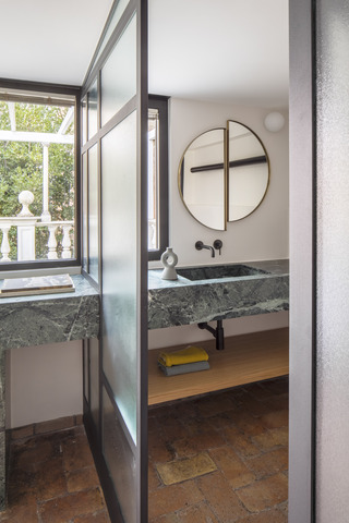 浴室門片兼作淋浴間牆面,Verde Alpi大理石洗手台則穿過玻璃牆,形成共享檯面設計,展現對空間效率的極致追求。頂樓露台鋪設兩種綠色的壓實石材,與周邊植栽融為一體,呼應建築的色彩敘事。值得一提的是,石材的質感與色調刻意與室內Verde Alpi 大理石相互對話,創造由內而外的連貫體驗。
