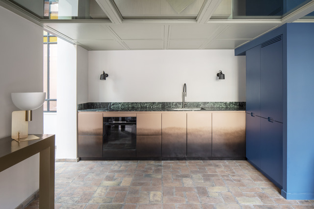 為加深縱向視景,客廳布置一面挑高大窗,戶外盎然綠意與義大利藝術家Bruno Munari所設計的Falkland吊燈形成對話。為妥善運用空間,廚房捨棄傳統吊櫃,檯面則鋪上Verde Alpi大理石,搭配從黑到桃紅的漸變色櫃體,與原始赤陶磚地板相呼應。另外,一樓的深藍量體,一側整合為冰箱與食品櫃,另一側則將客廁巧妙隱藏。