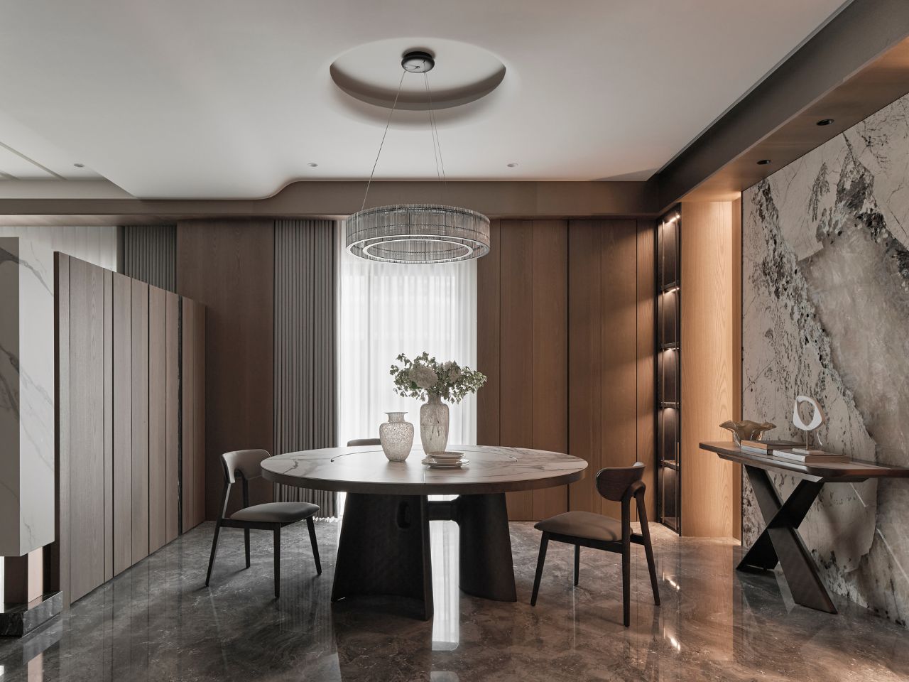 全作將東方美學的內斂精神,以現代設計語彙重新詮釋。從天花的雕塑感造型,到金屬收邊的細膩筆觸,處處都在沉穩基調中展現精緻質感。精準的比例劃分形塑視覺平衡,賦予空間獨特的秩序韻律,最終成就一處能安頓身心、與窗外壯闊對話的靜奢雅境。