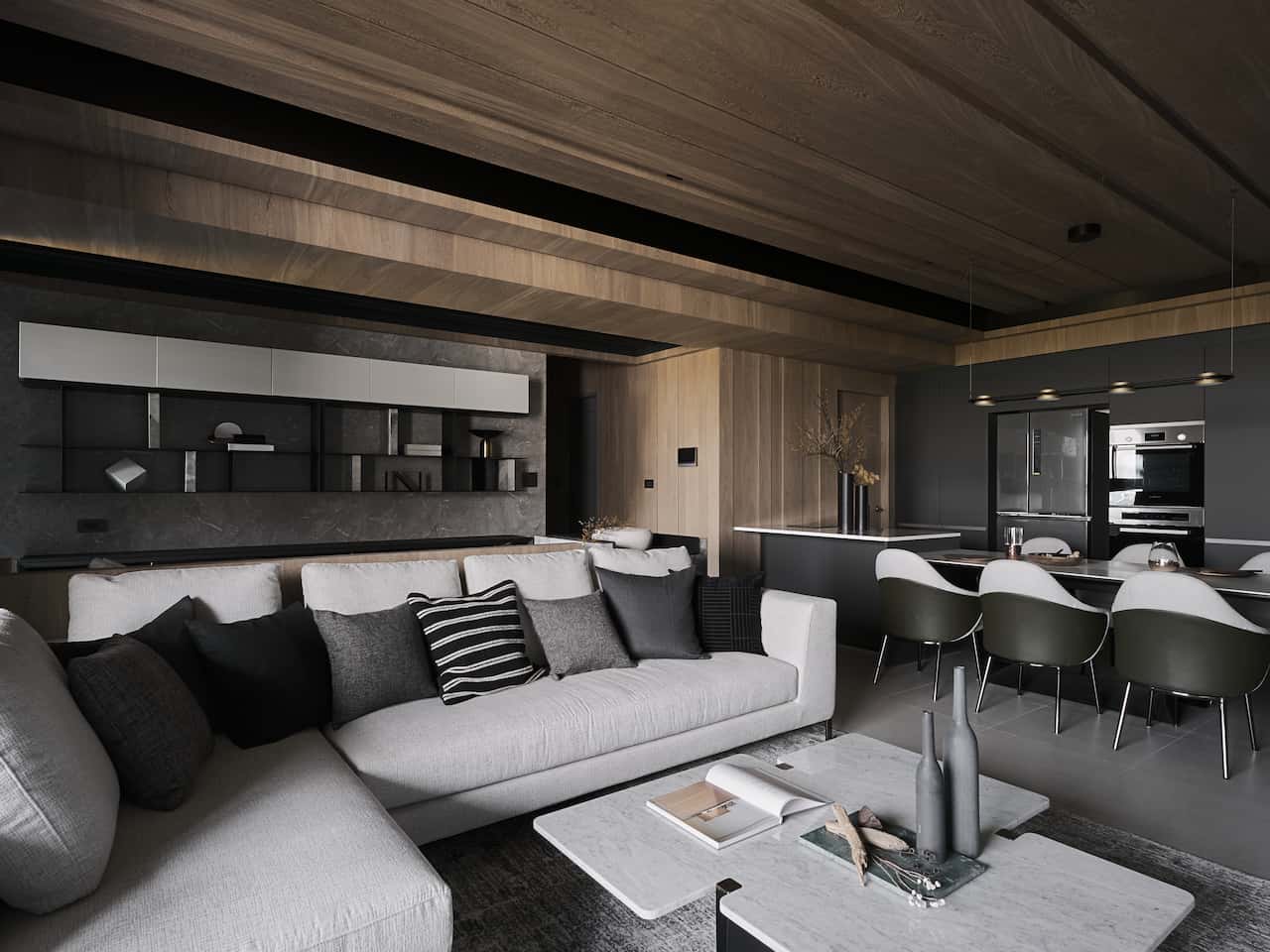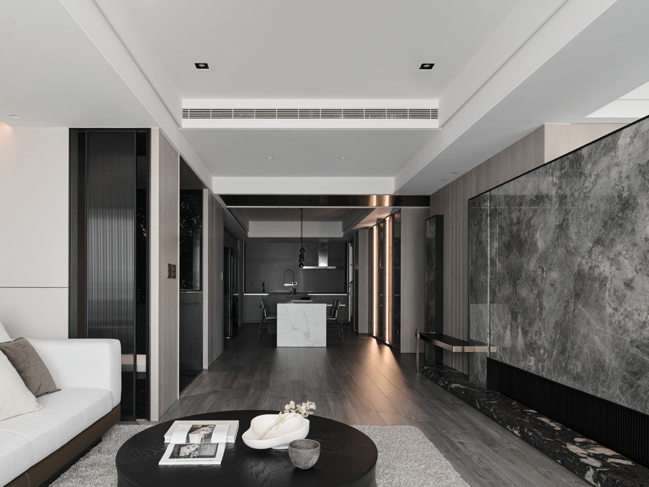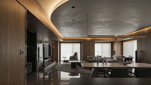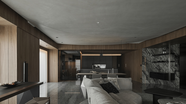 踏入玄關,大面石材鋪覆沉穩大氣,兩側隱藏式櫃體巧妙兼顧收納與美感。鍍鈦金屬包覆的通道門框,不僅勾勒低調奢華的層次,更為空間轉換勾勒具儀式感的過渡情境。開放式公領域串聯起客廳、餐廳與多功能室,讓家人間的互動更加緊密。天花突破傳統束縛,運用雕塑般的切挖手法與自然曲線,創造高低錯落的無聲韻律。光影在空間中自由流動,與材質肌理相互輝映,勾畫豐富的視覺層次。