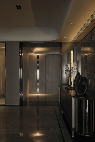 玄關以石材為基底勾勒沉穩,搭配金屬門框低調點綴奢華,形塑充滿儀式感的過渡場景。