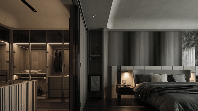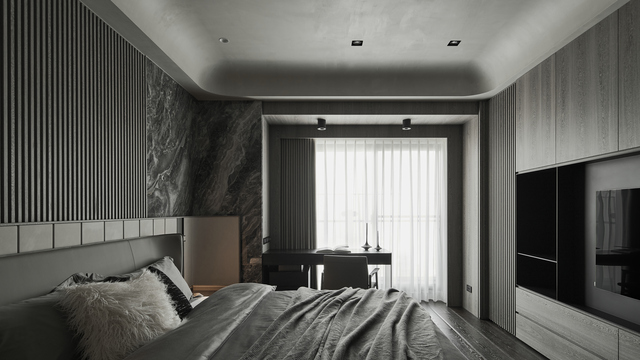 主臥延續公領域風格,以灰調作為基底,選用石材與木格柵相搭,利用線條俐落分割,從簡約中注入精緻細節。