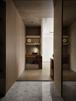 玄關茶鏡拓展景深,地坪雕刻白石材碎化有序,與公領域木地板相映成趣。