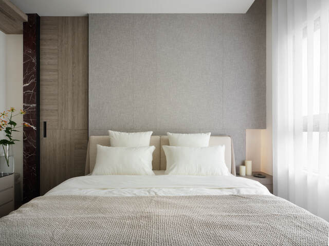 主臥空間有限,僅於單側設置床頭櫃,但仍預留從容通道,維持開闊舒適的行走體驗。