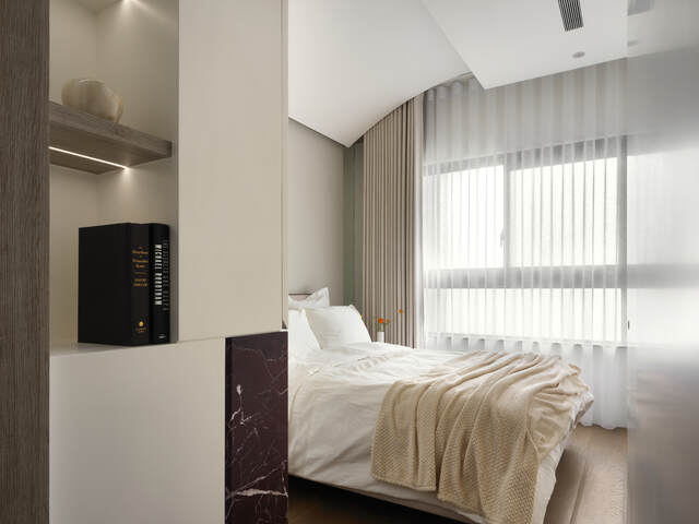 次臥透過弧形天花虛化樑柱存在,並將其轉化為引導光線的媒介,使光帶自然流向床頭,兼具造型與情境照明。