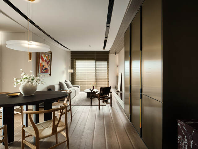 餐廳是整體空間核心,設計團隊考量屋主使用需求,補足高櫃與電器櫃,並將原有放置冰箱處外移,擴展收納空間,旁側則整合迷你吧台,內嵌紅酒冰箱,形成流暢的輕食動線。其金屬門片與電視牆作異材搭配,在預算與質感間取得完美平衡,其紋理在光線折射下呈現豐富的層次變化。